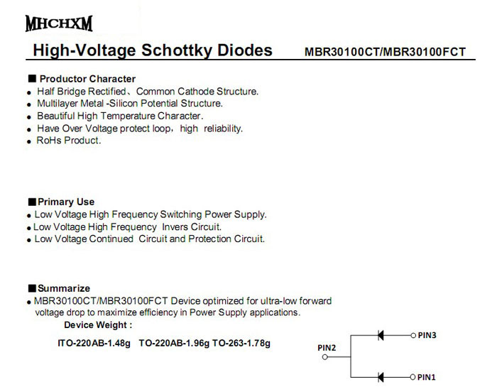 产品名称:肖特基MBR30100H,MHCHXM品牌