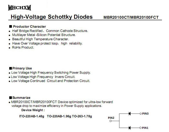 MHCHXM 肖特基二极管MBR20100H中文资料,MHCHXM 品牌原装肖特基二极管MBR20100H参数,大电流肖特基MBR20100H电性资料PDF下载, MBR20100H肖特基二极管. 详询400-9929-667